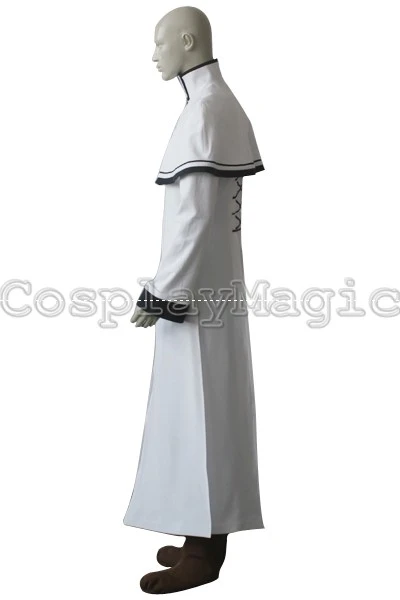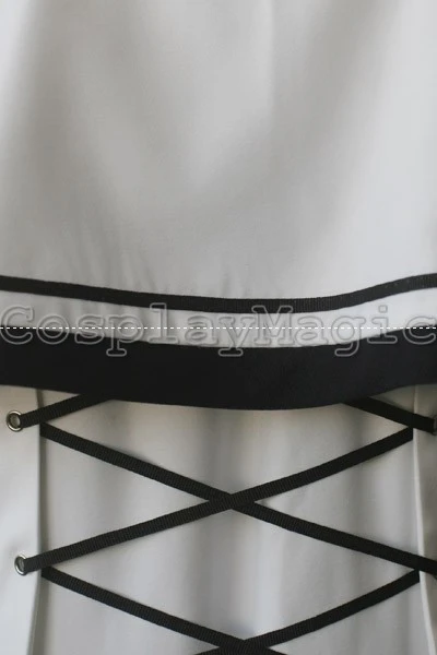 - White robe with black cuffs and edges, criss-cross stitching on the back