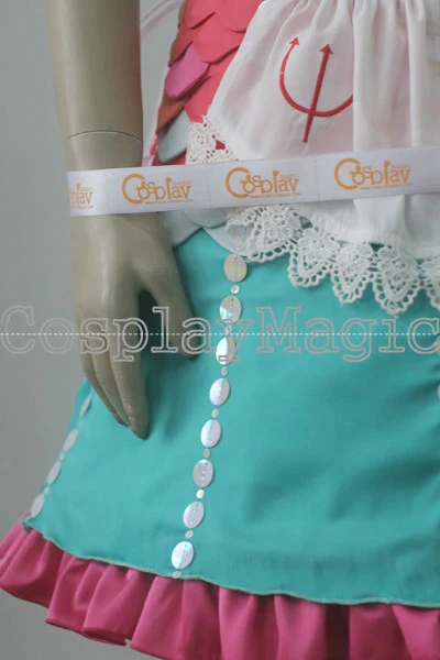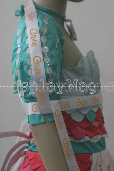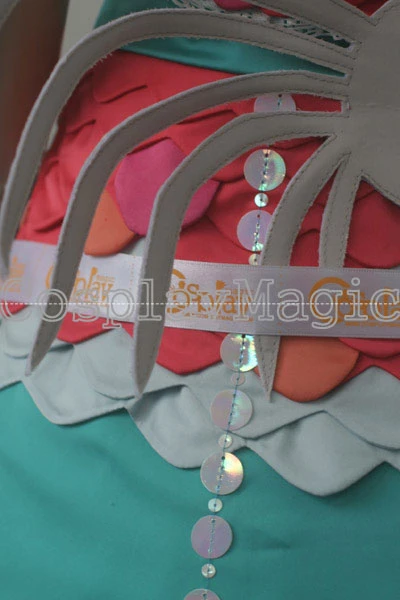- Puff sleeve dress with sequins based on bioluminescent deep sea creatures, the bust shaped like seashells, the pink bodice based on corals, the apron embroidered with astronomical signs of Luna and Neptune, scorpions on the back