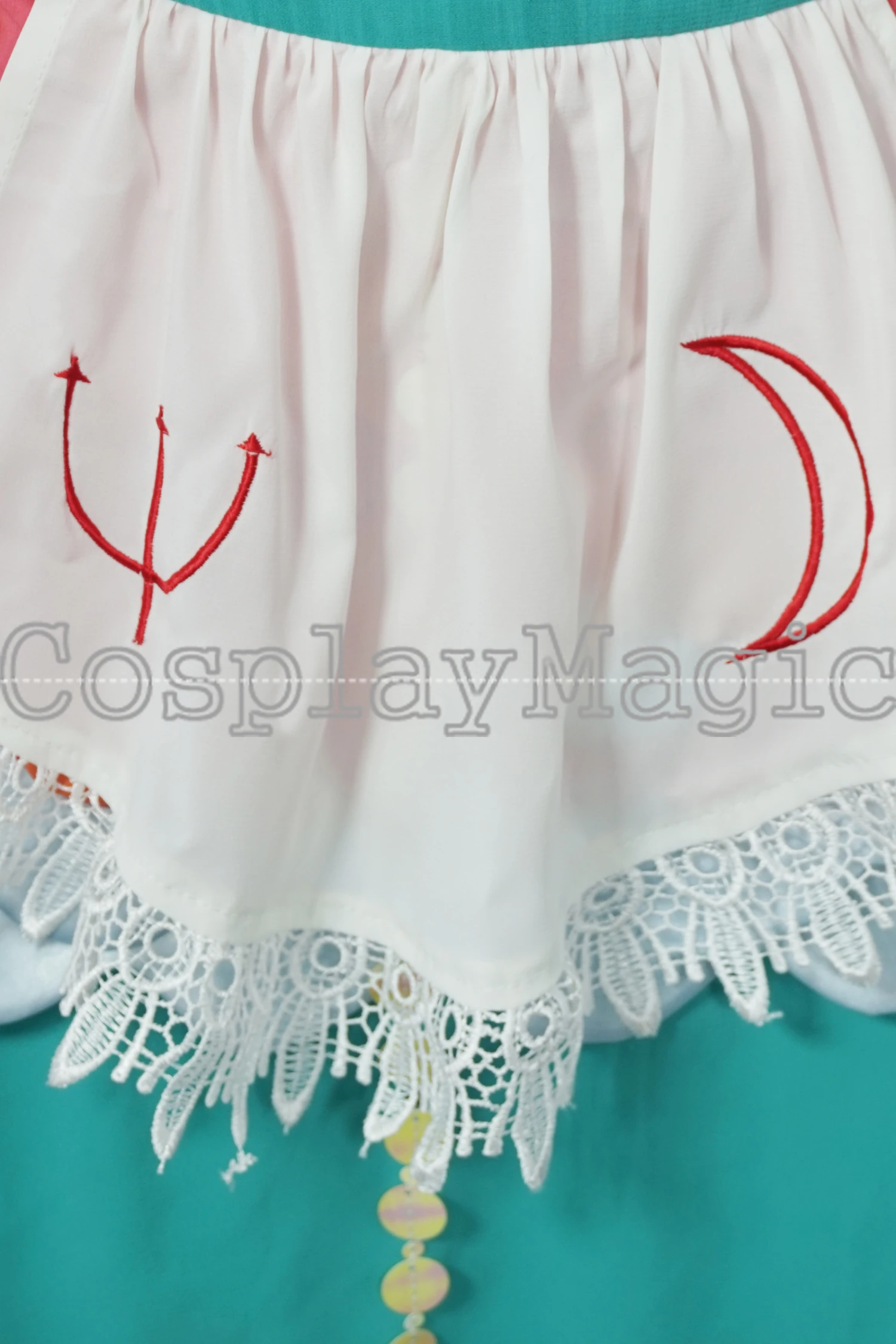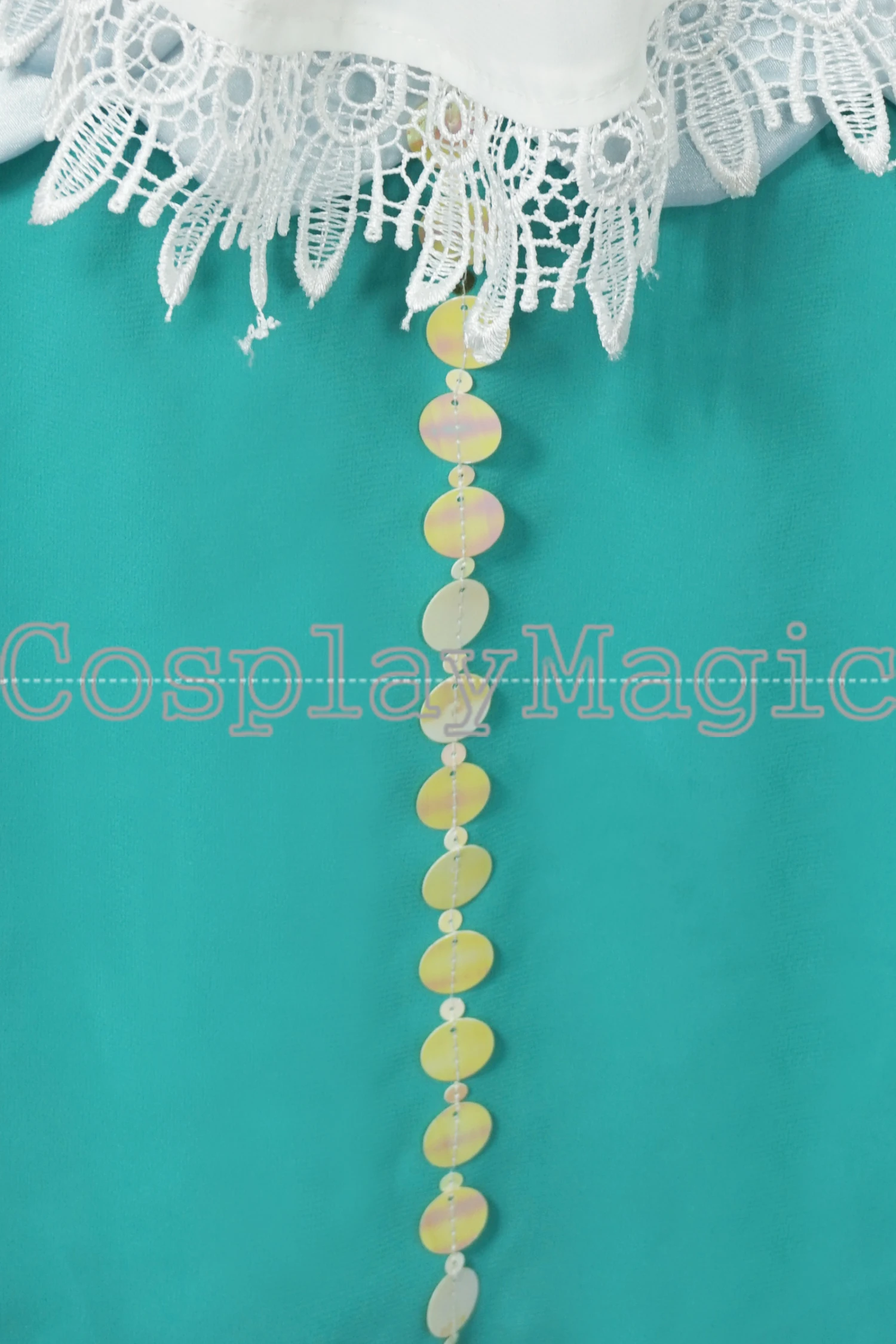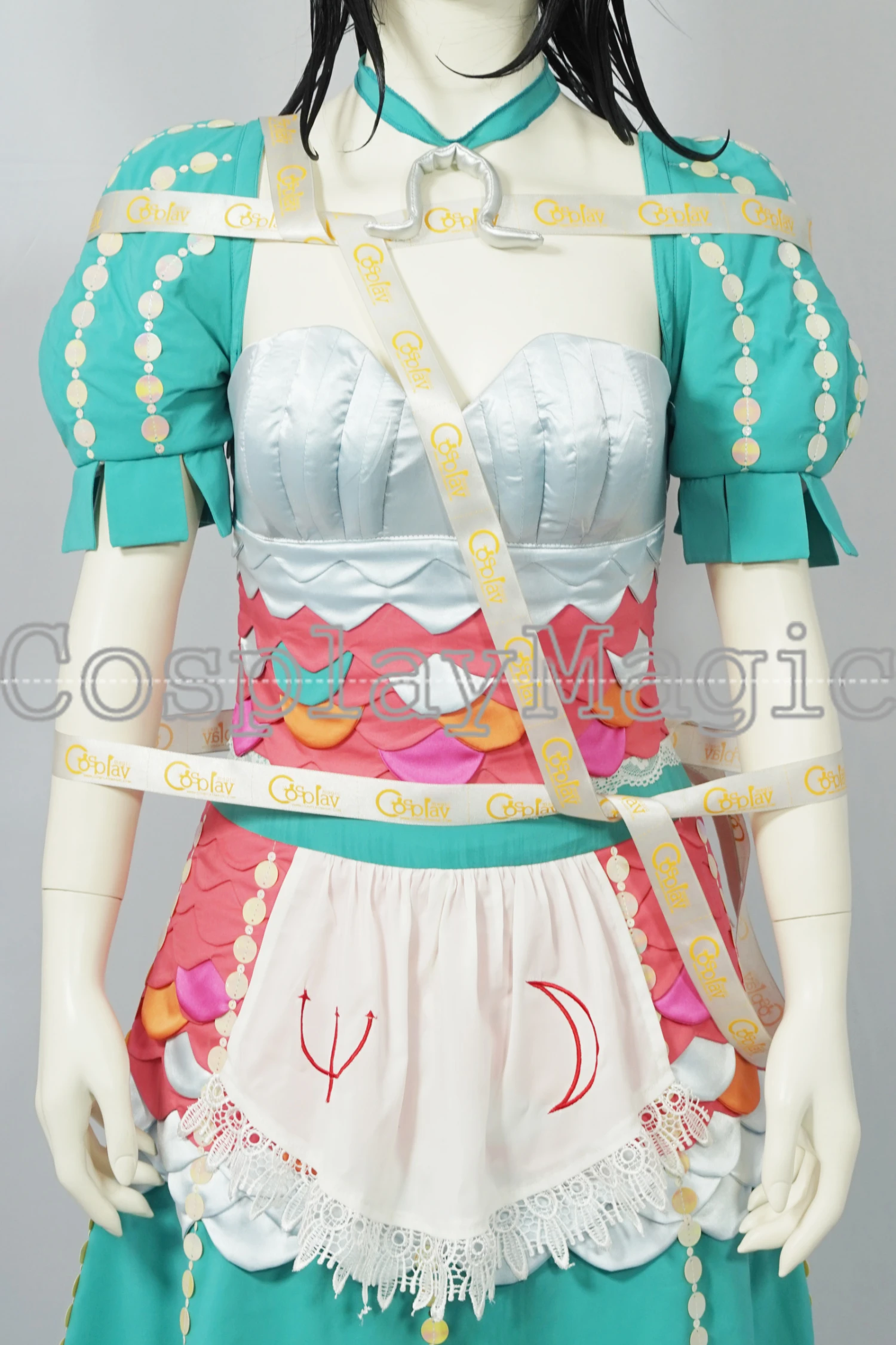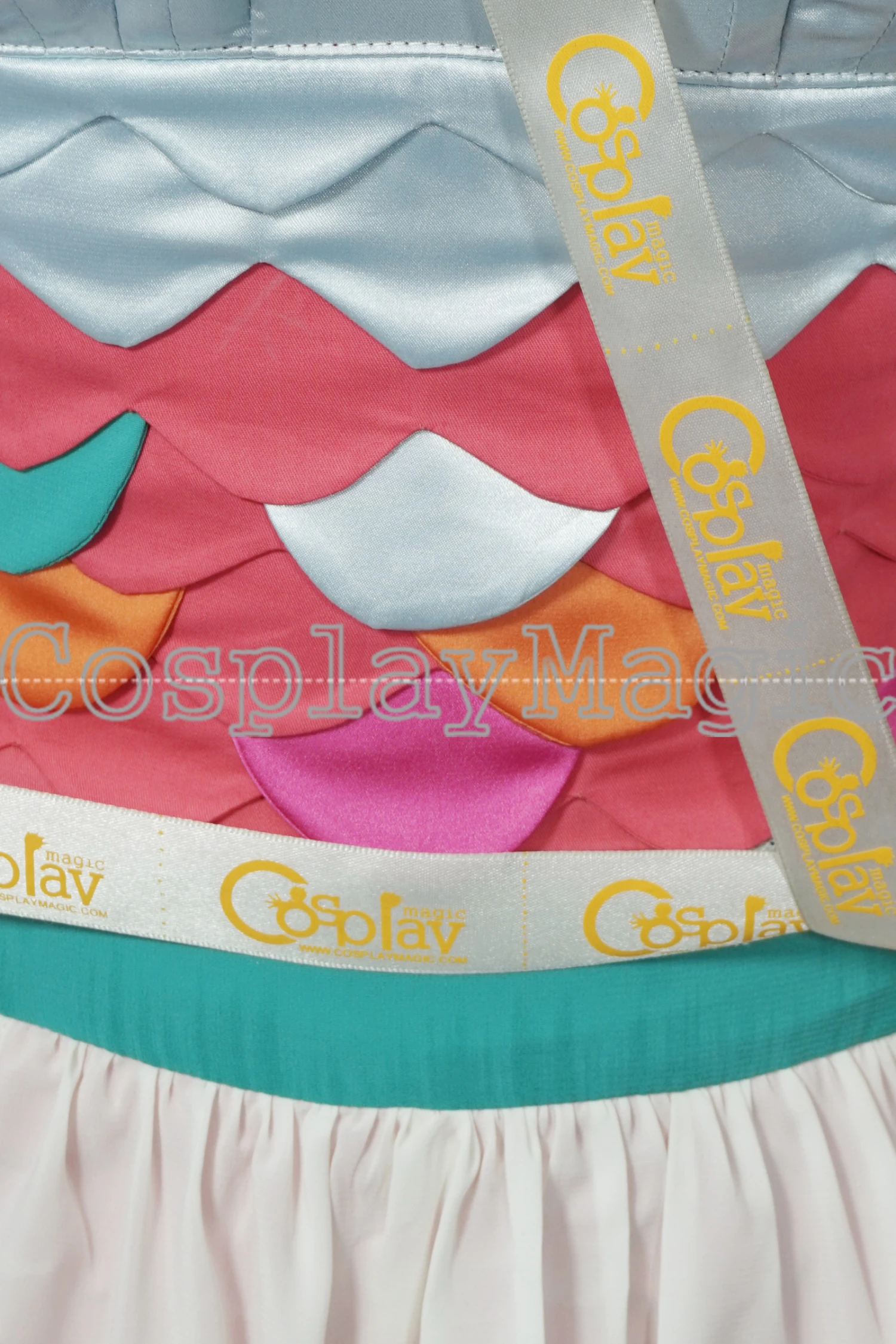 - Puff sleeve dress with sequins based on bioluminescent deep sea creatures, the bust shaped like seashells, the pink bodice based on corals, the apron embroidered with astronomical signs of Luna and Neptune, scorpions on the back