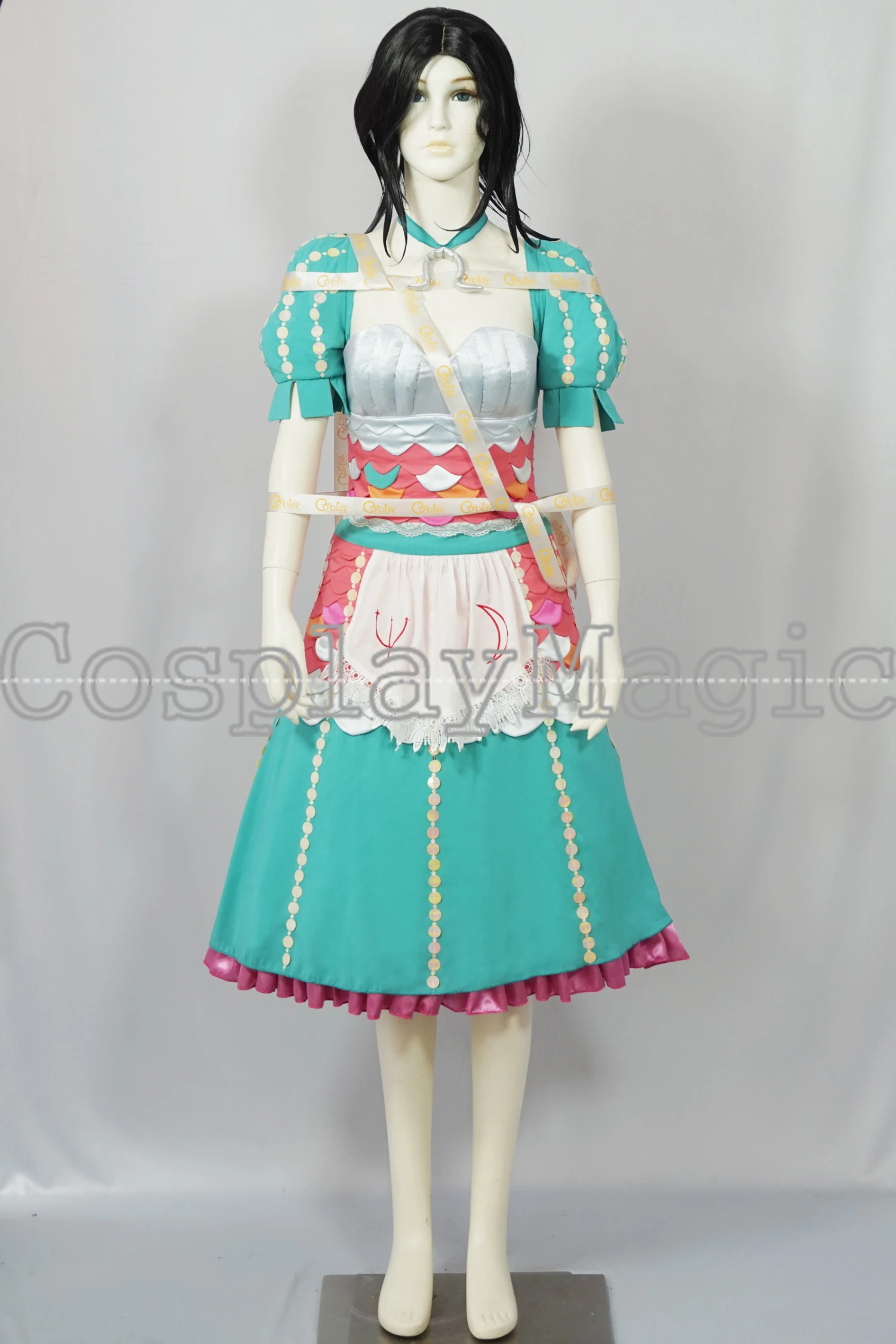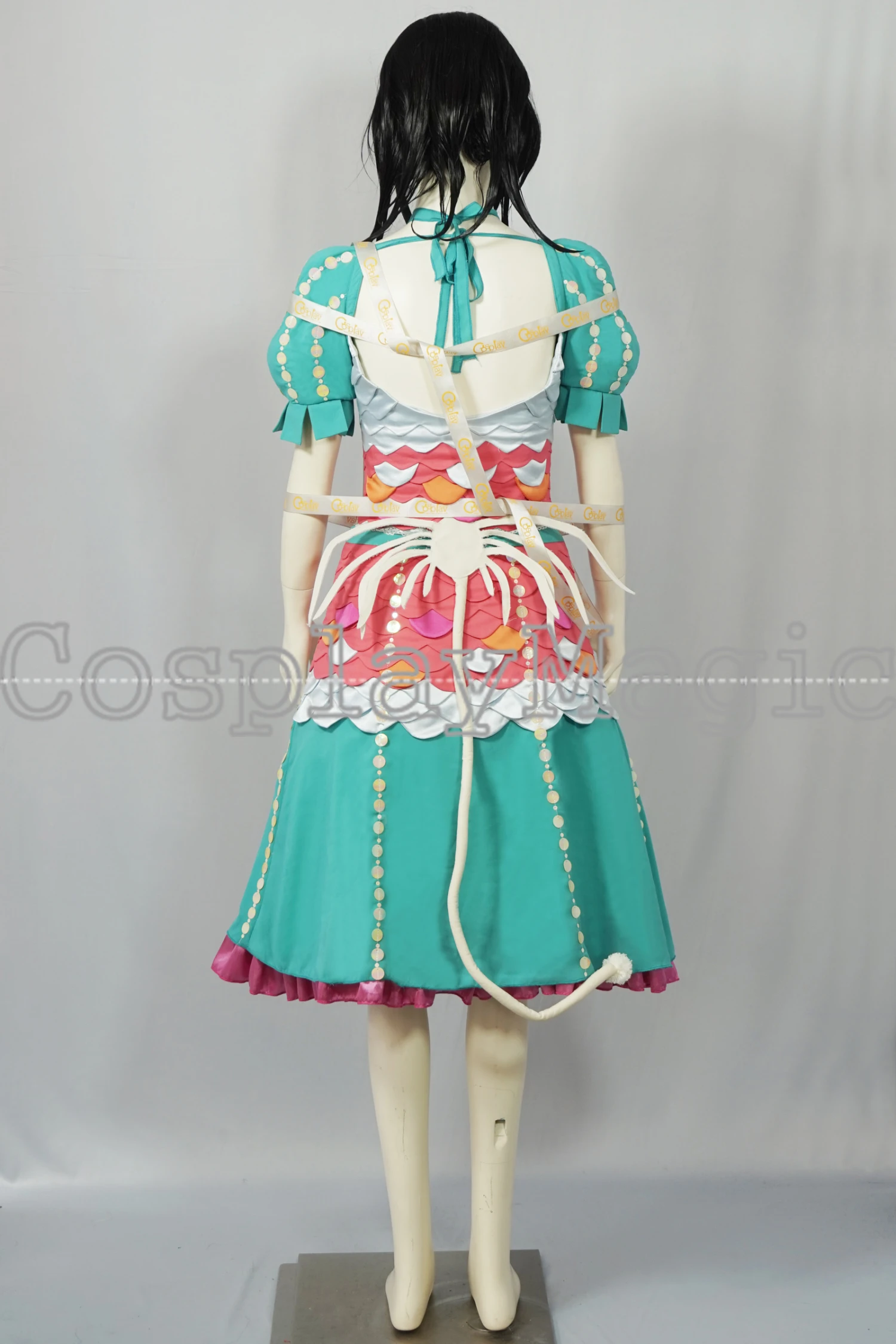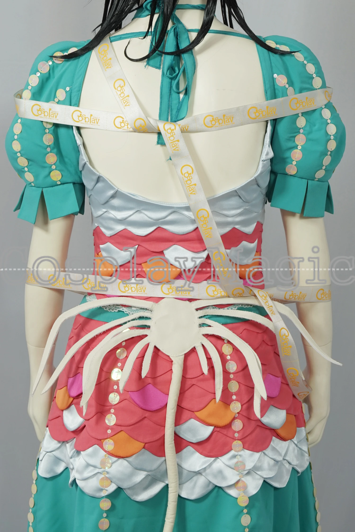 - Puff sleeve dress with sequins based on bioluminescent deep sea creatures, the bust shaped like seashells, the pink bodice based on corals, the apron embroidered with astronomical signs of Luna and Neptune, scorpions on the back