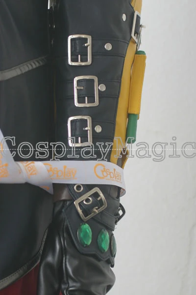 - Dark faux leather gloves and leg protectors