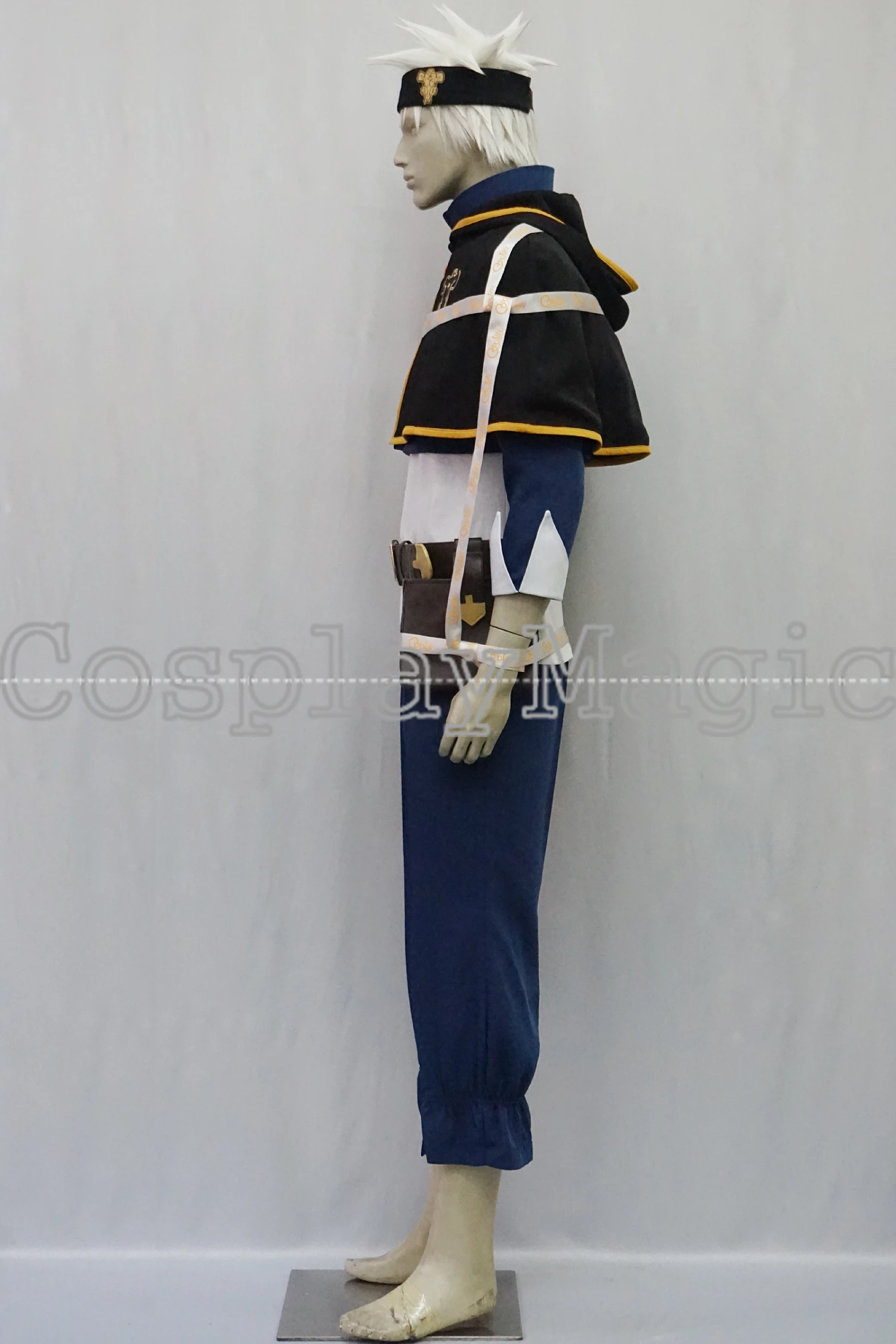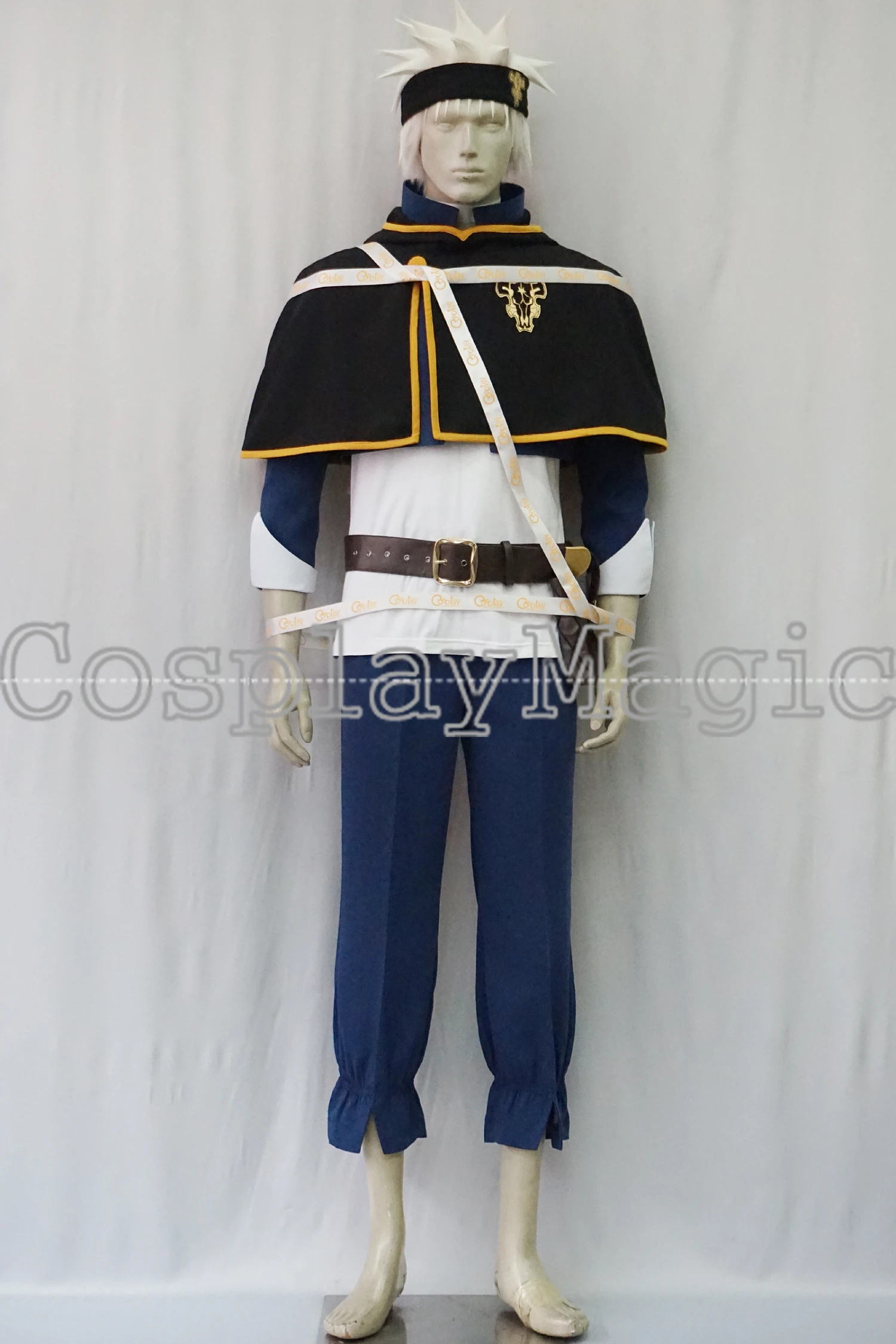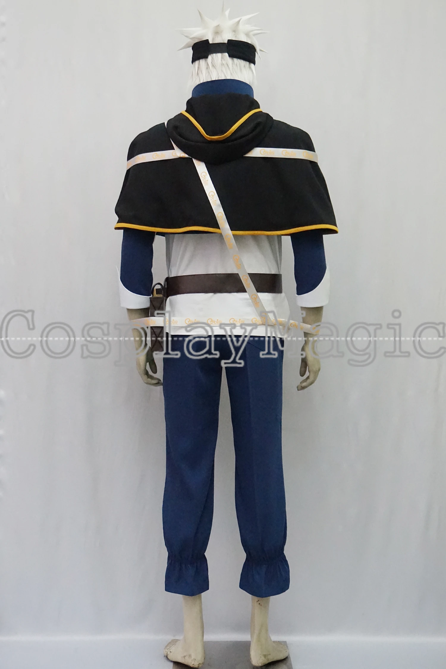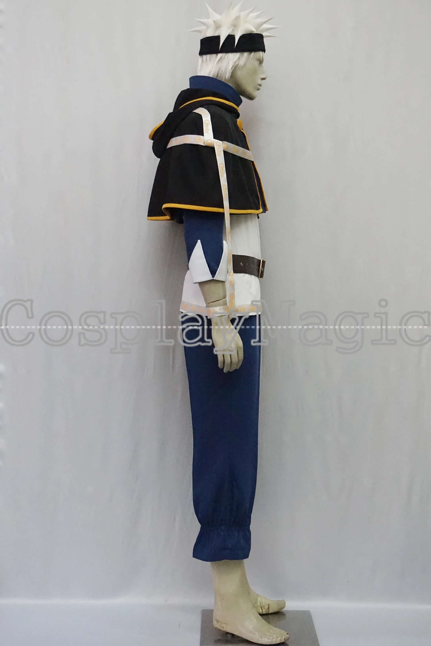 Package include: white shirt, blue jacket with hoodie, pants, black shirt cape, headband, belt, pouch.