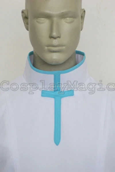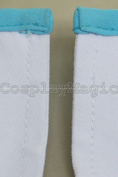 - White clothes with light blue trim and light blue belt
