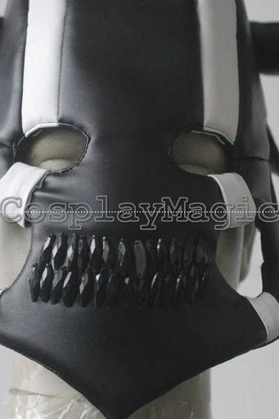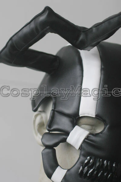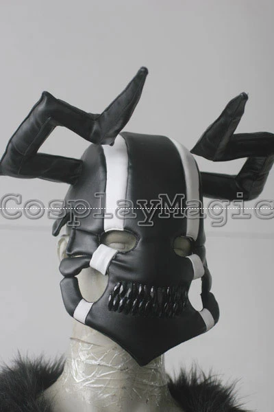 - Black horned mask with white lines stretching vertically across the eyes