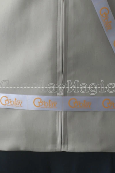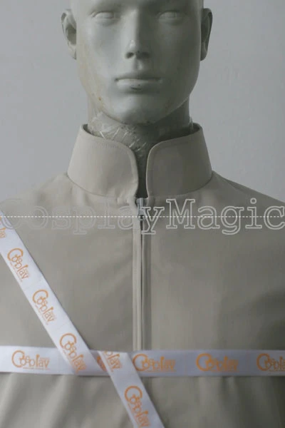 - High-collared beige jacket, zip front