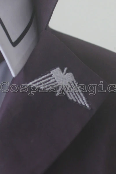 - Dark purple collared jacket with pink buttons