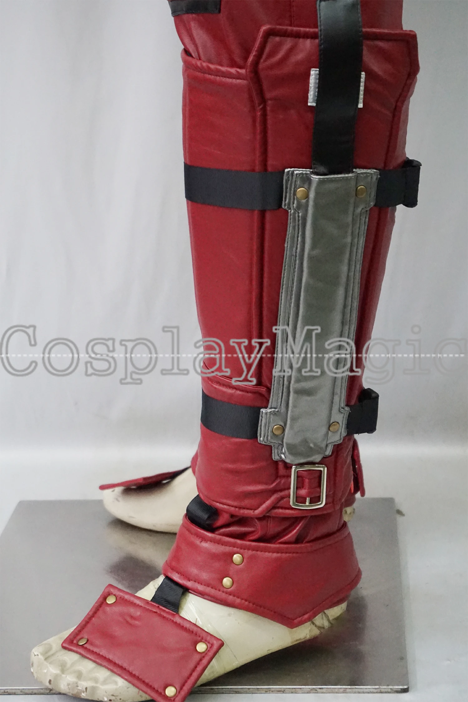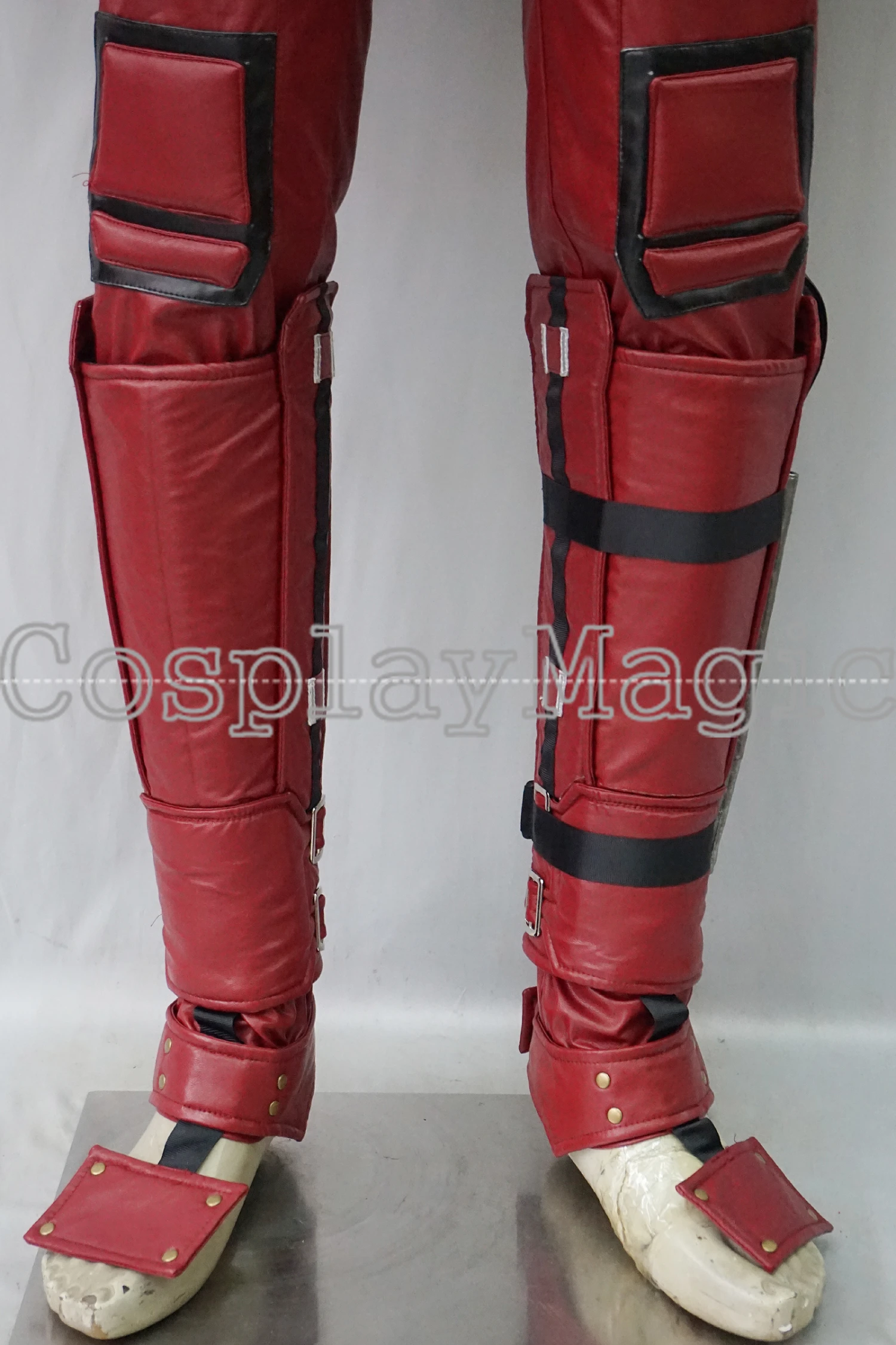 - Matched red and black faux leather trousers