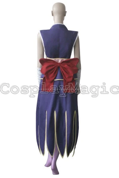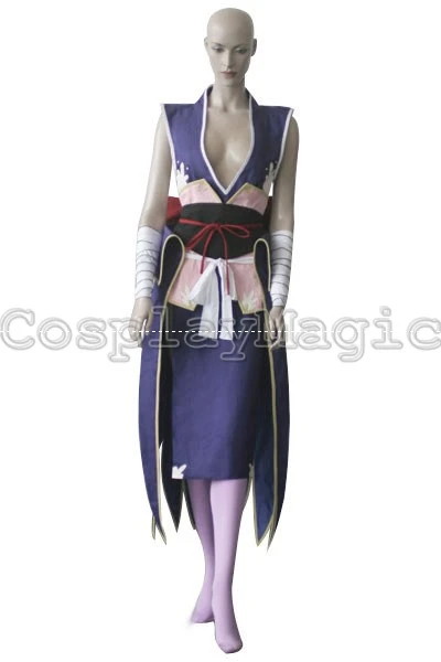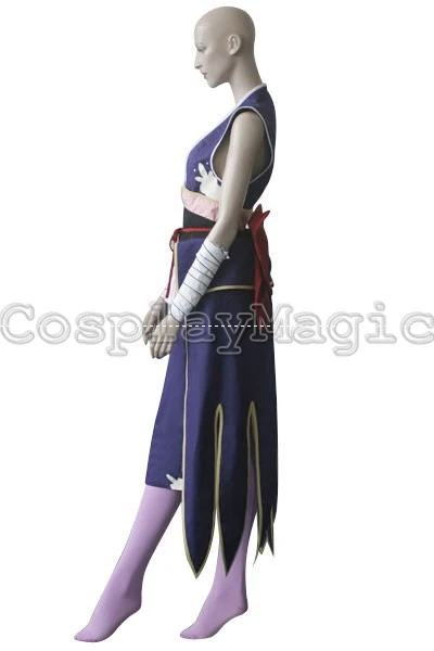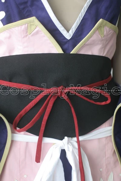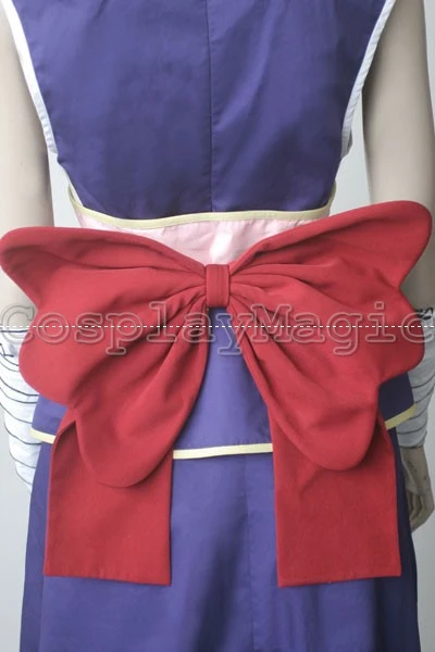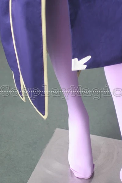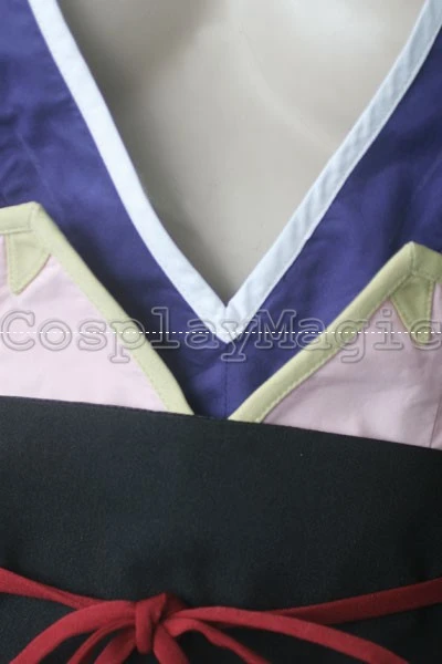 - Purple kimono with white faux leather flower motifs, a big red bow on the back