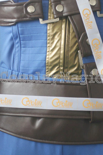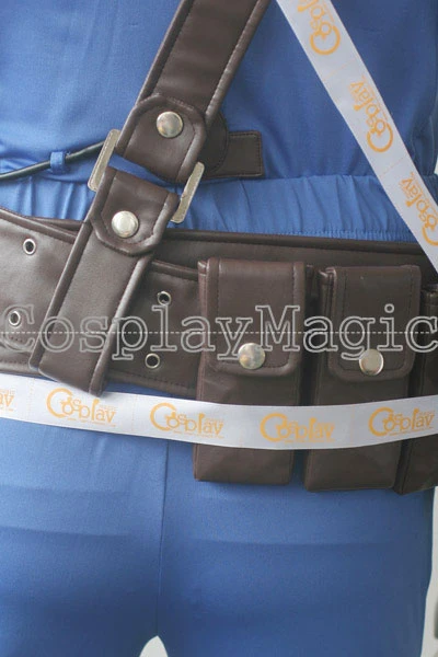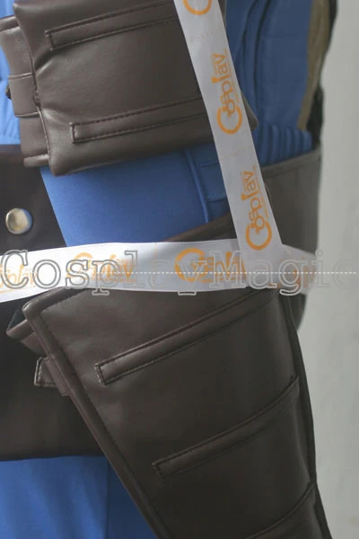 - Blue long-sleeved shirt with brown faux leather straps cross the chest