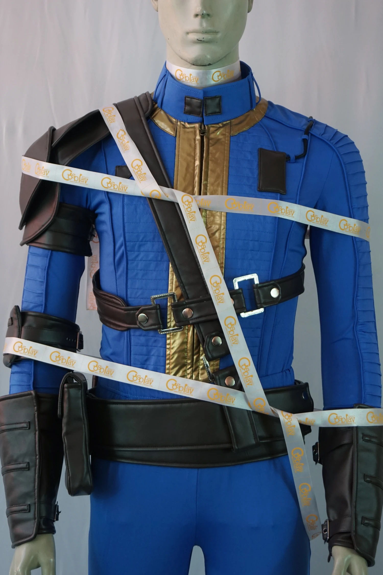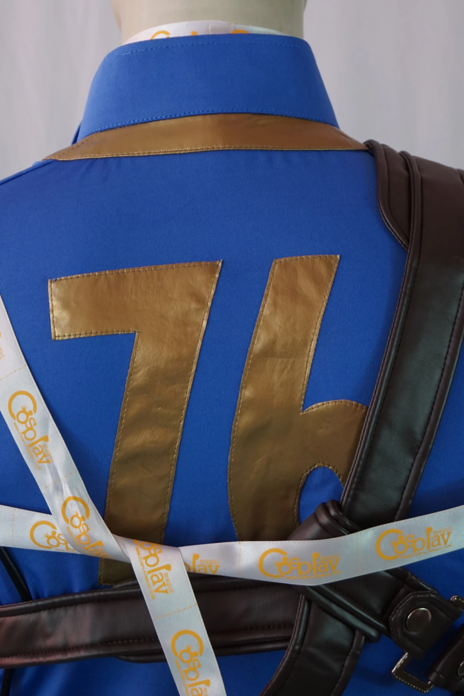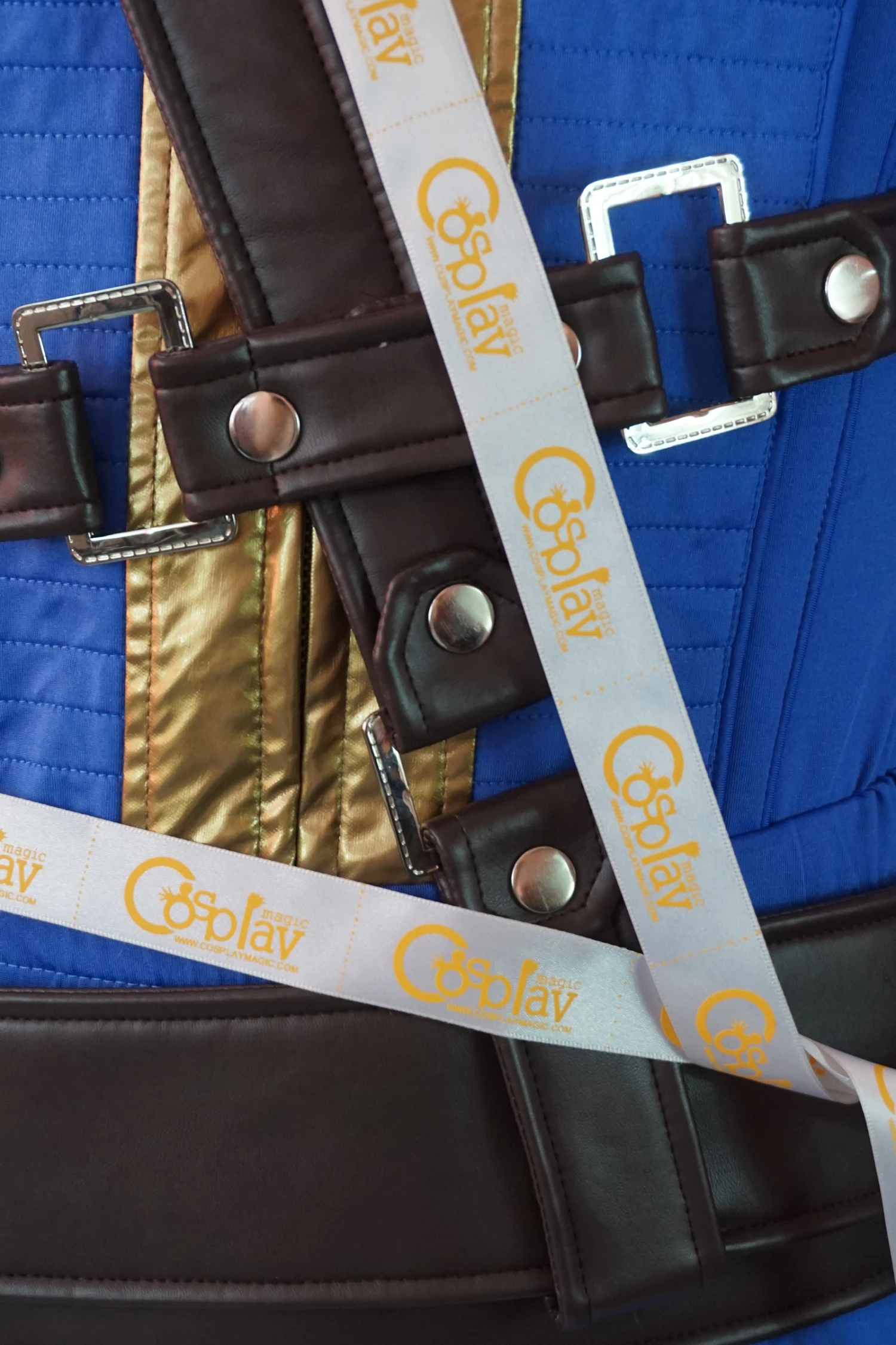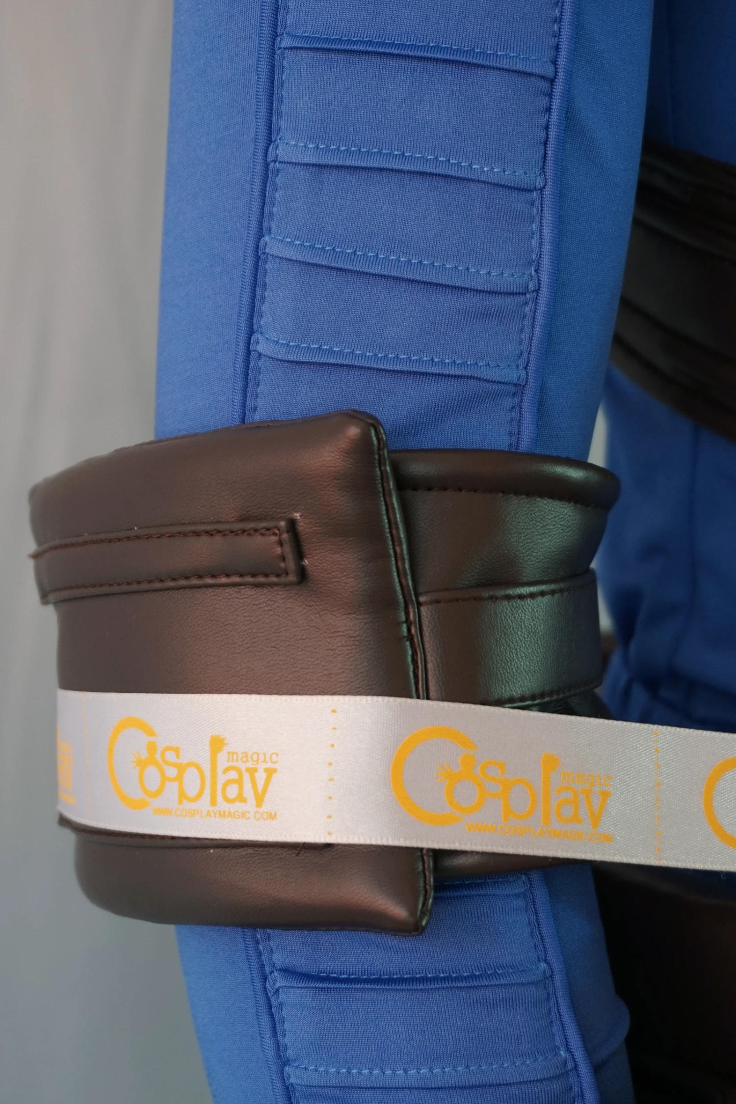 - Blue long-sleeved shirt with brown faux leather straps cross the chest