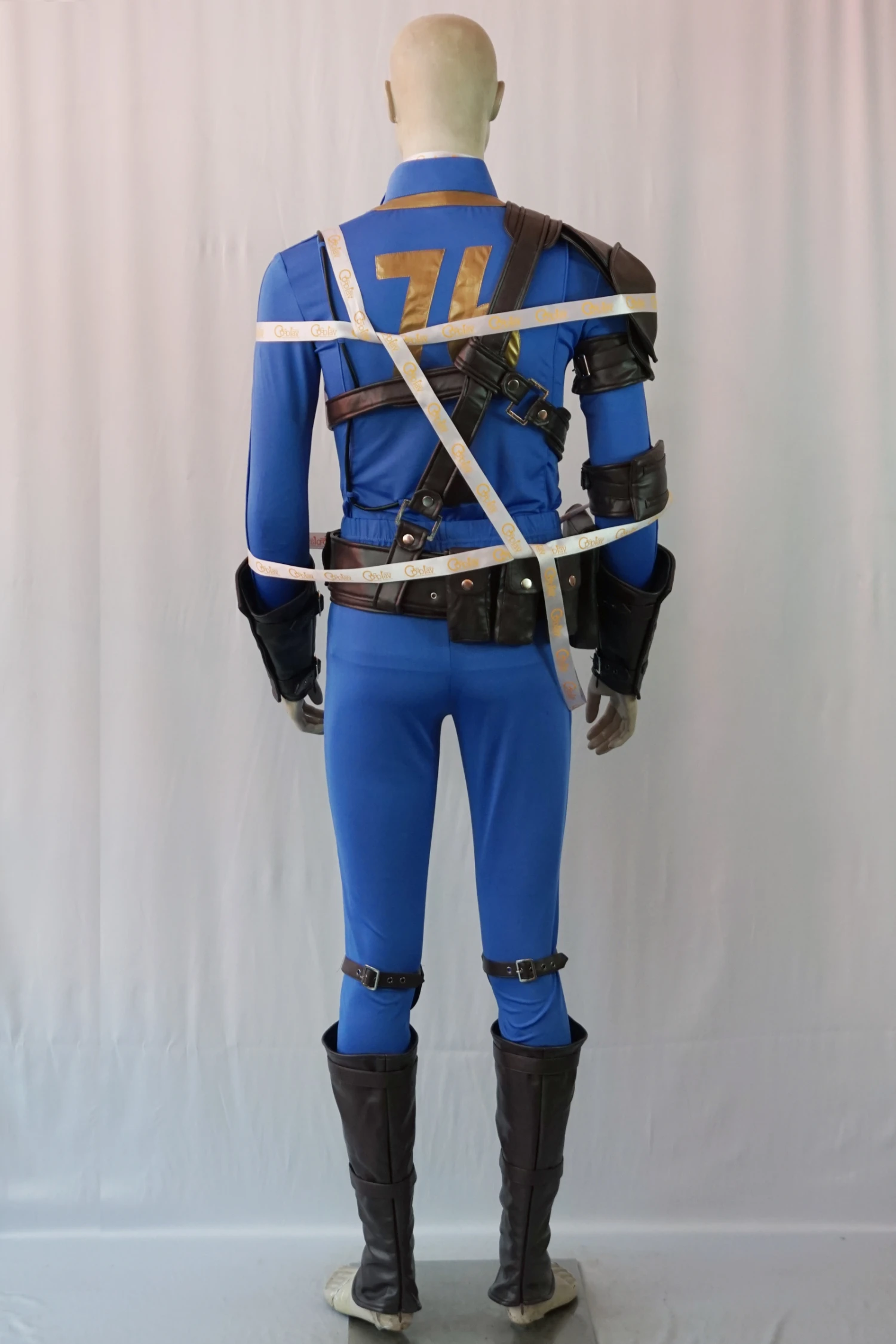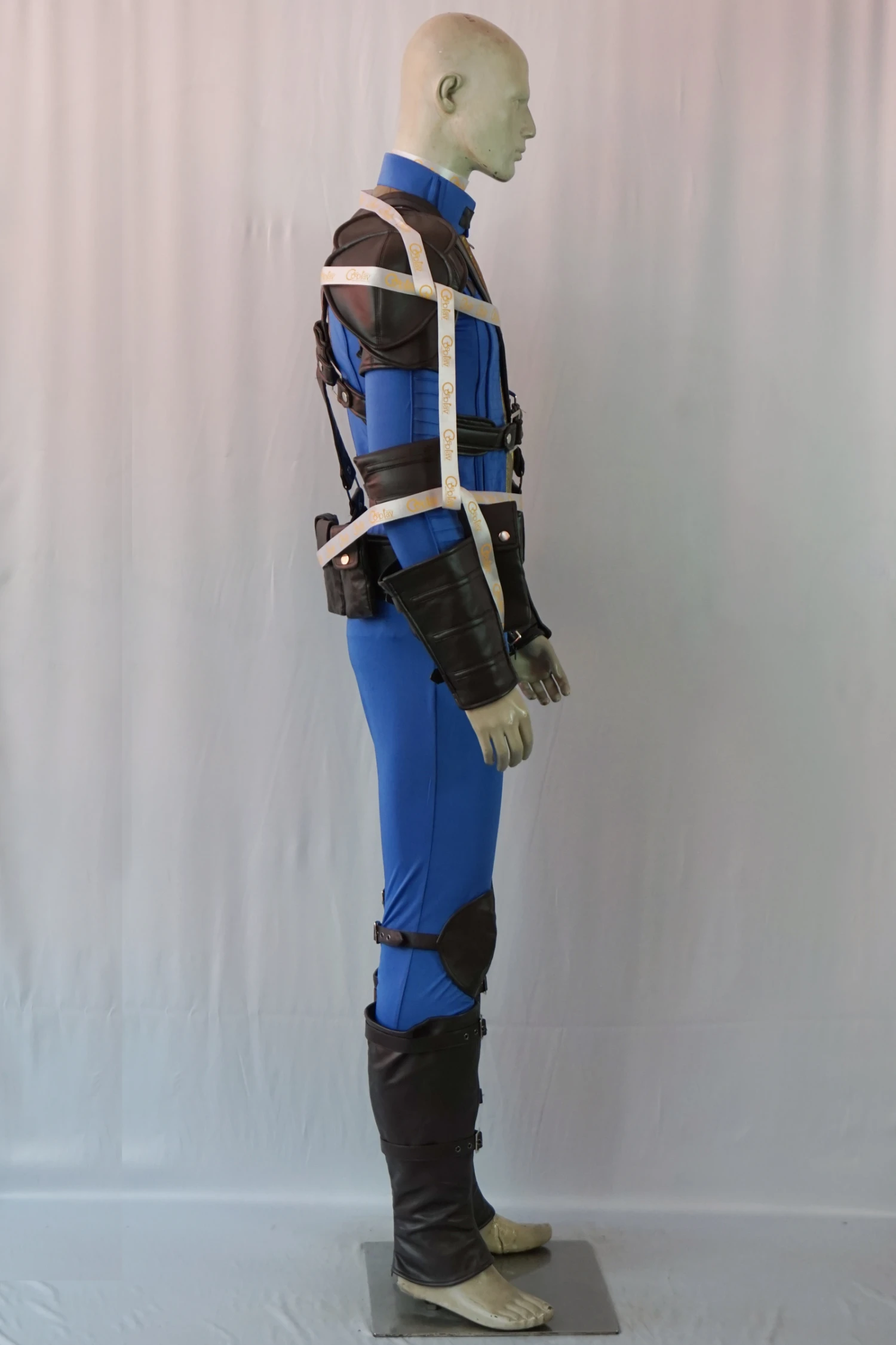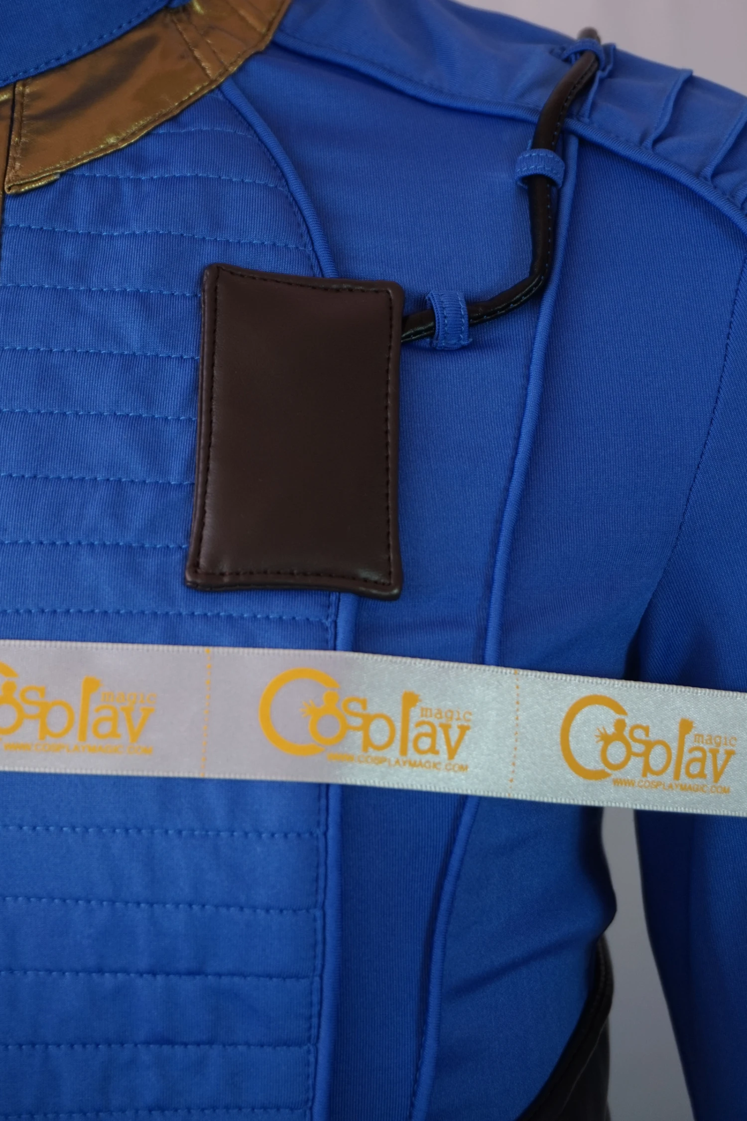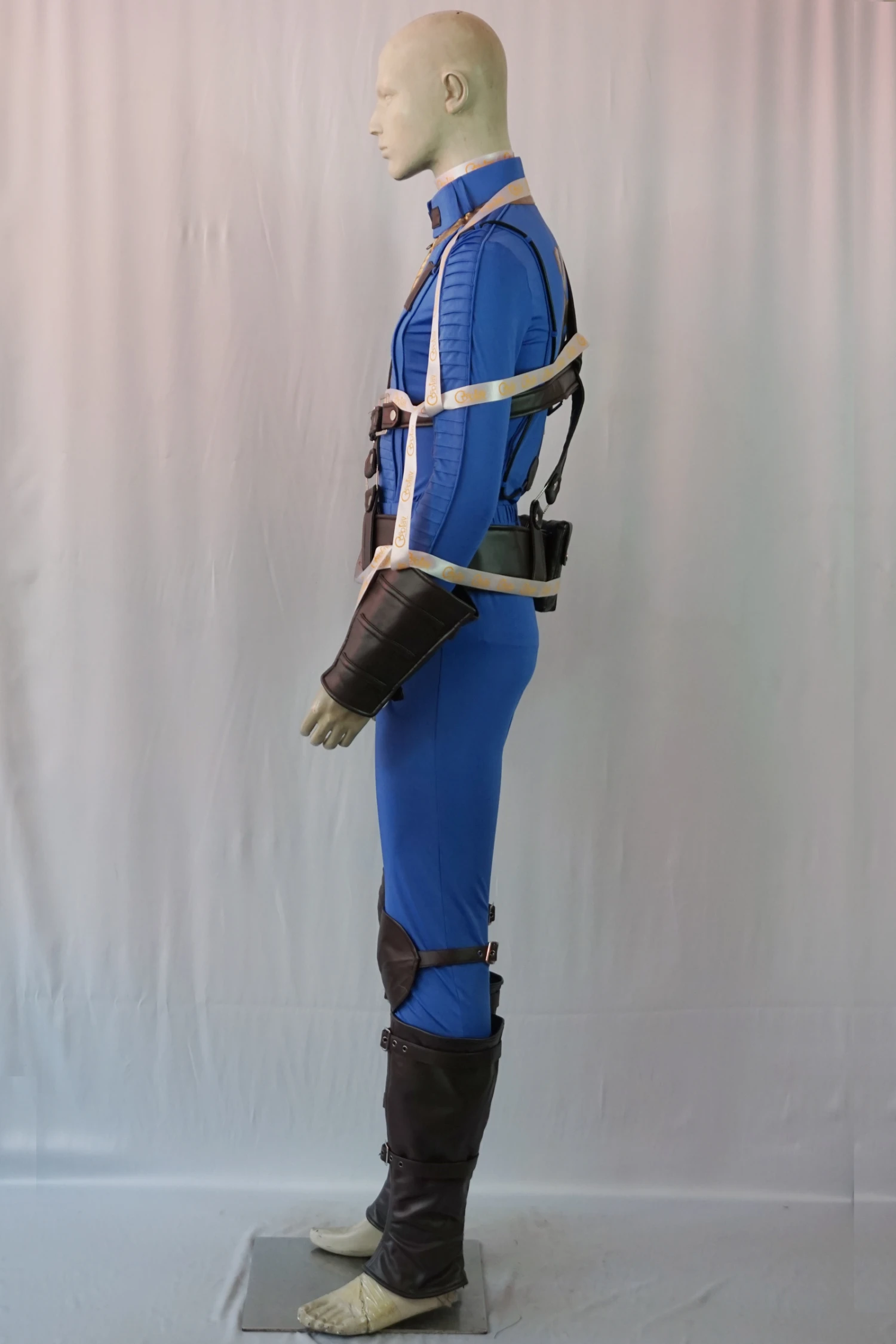 - Blue long-sleeved shirt with brown faux leather straps cross the chest