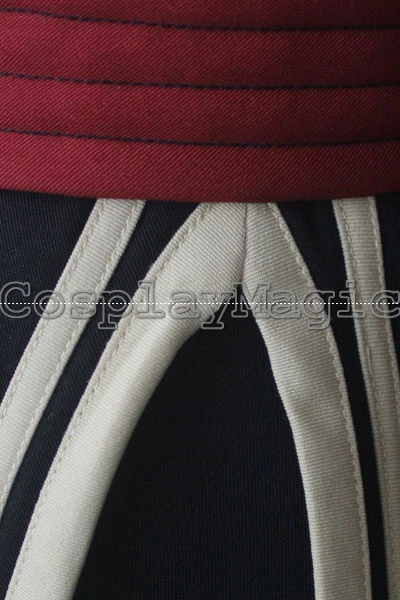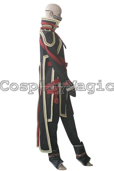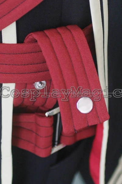 - Black high-collared coat with light-yellow edges, red stripes cross the chest