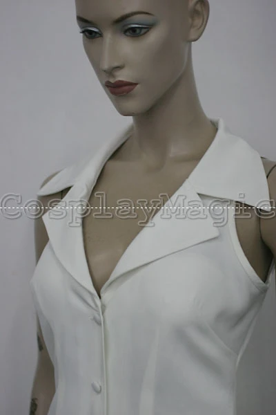 - Purple jacket with white sleeveless shirt underneath