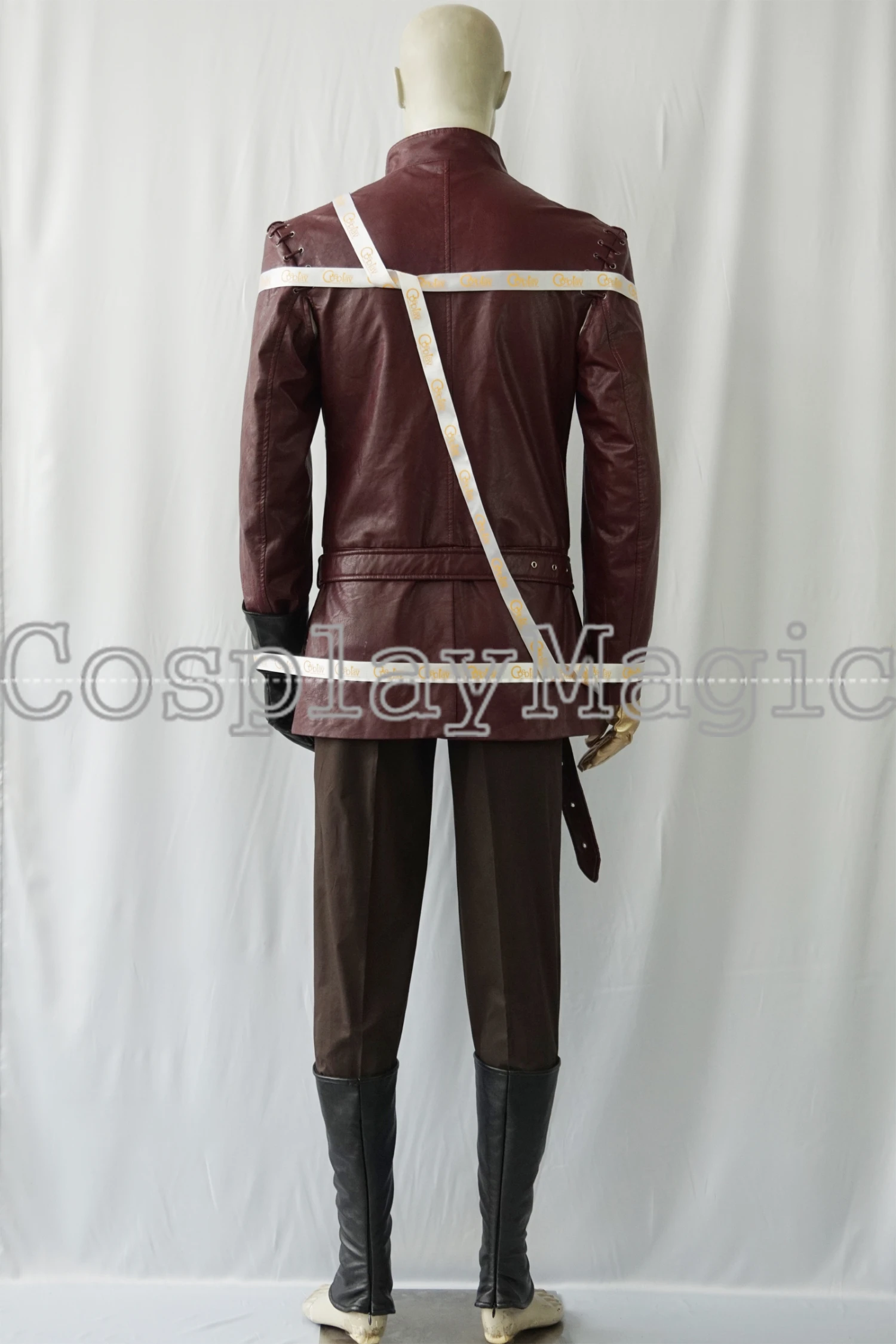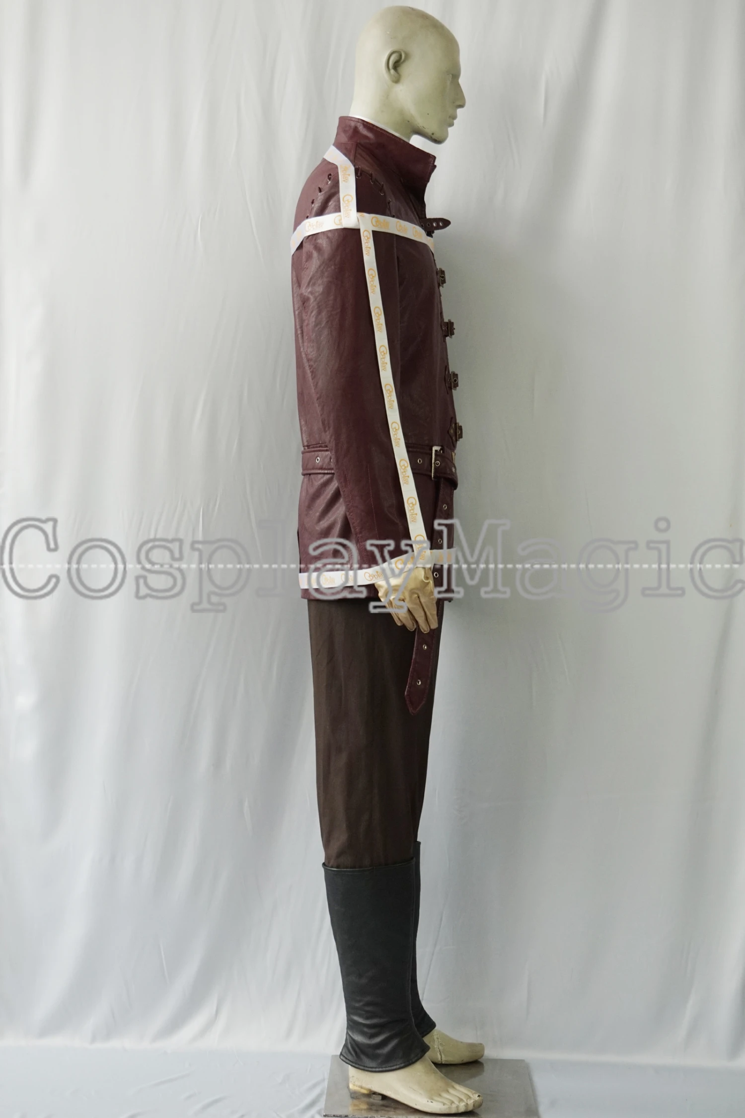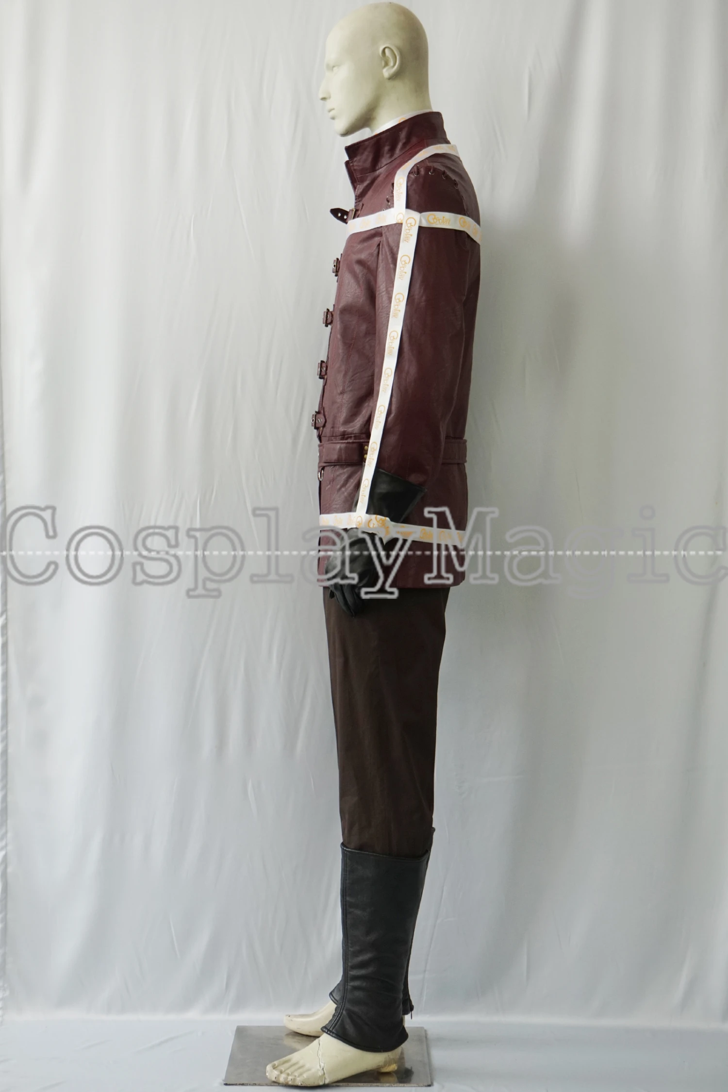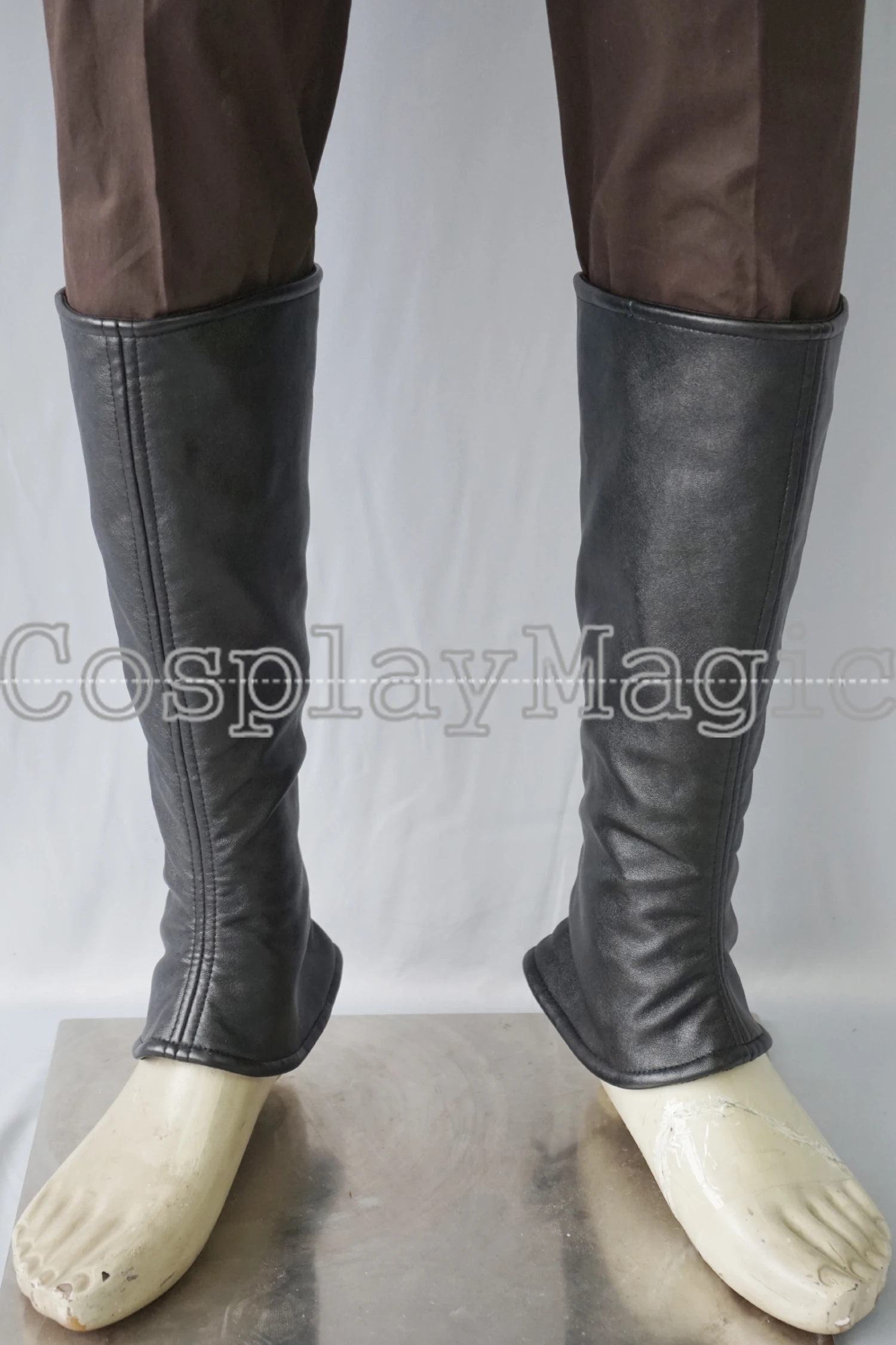 - Brown trousers with black faux leather leg protectors