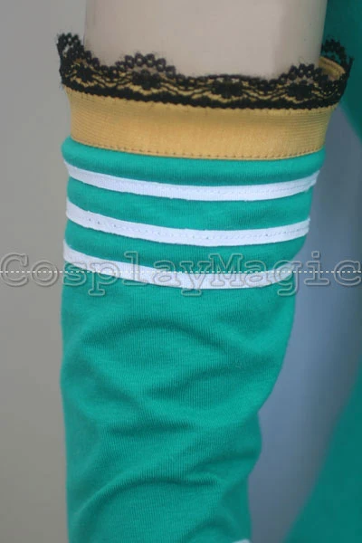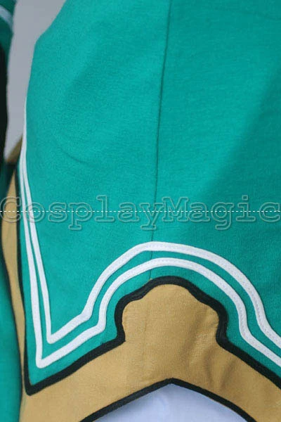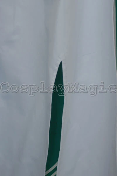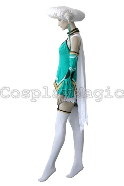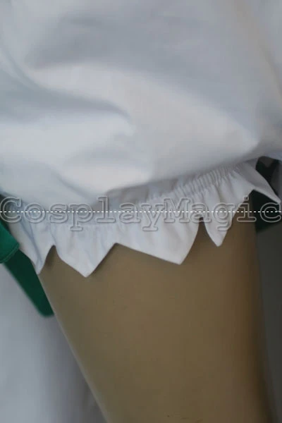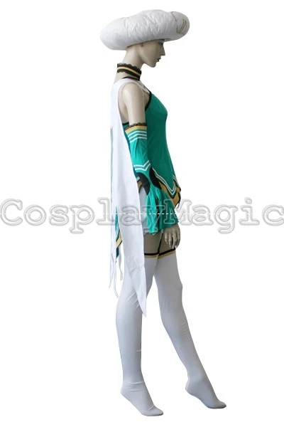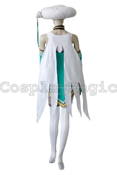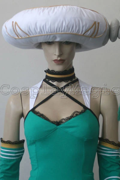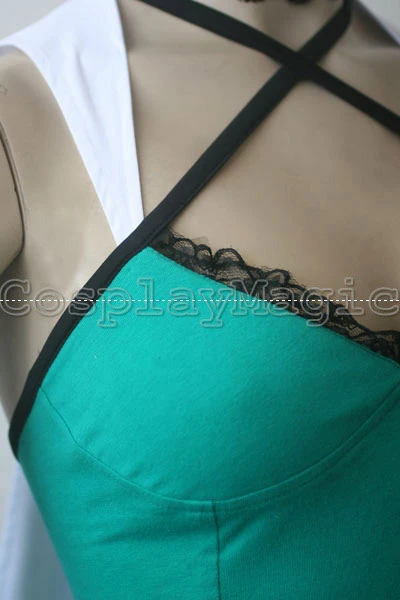 - Green dress with black lace trim and yellow hem, white wing-shaped mantle on her back