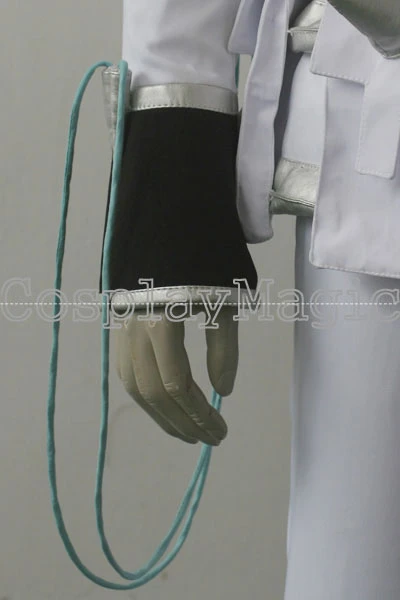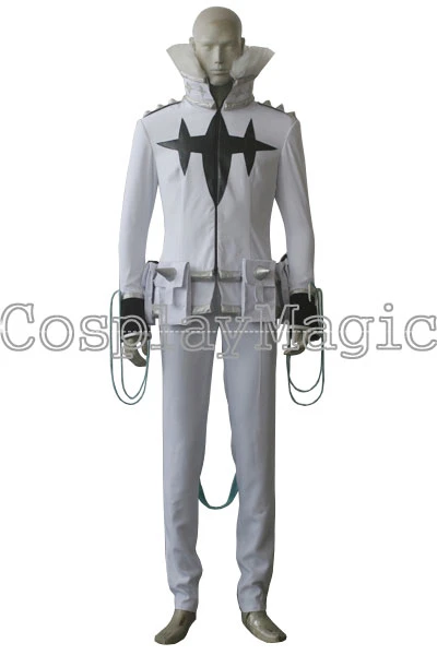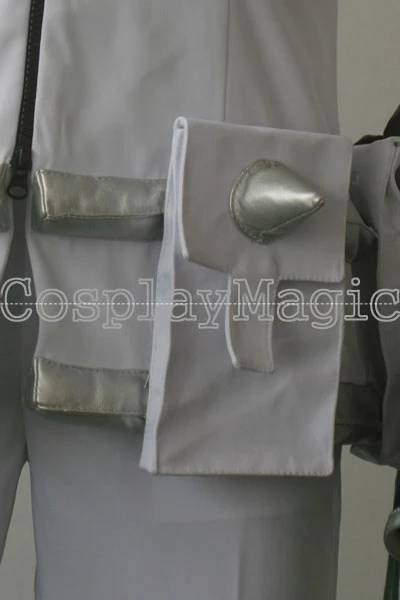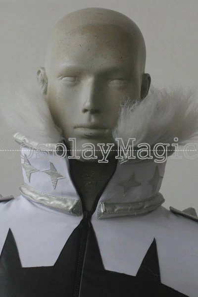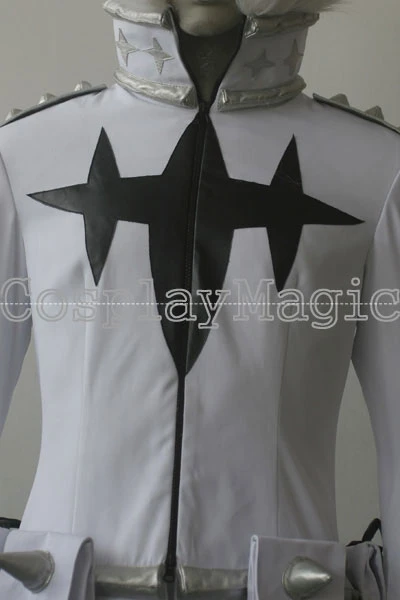 - High-collared white jacket, zip front