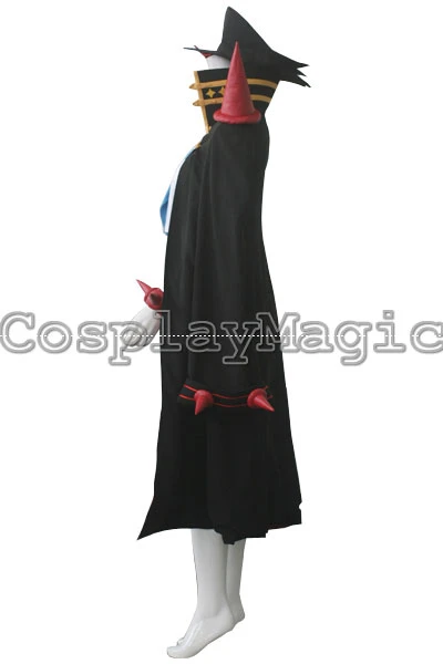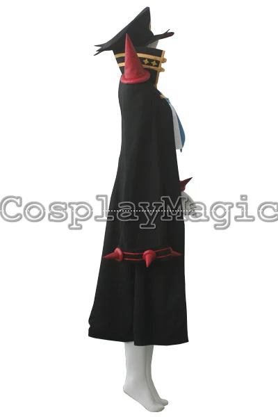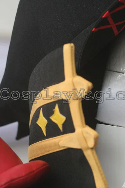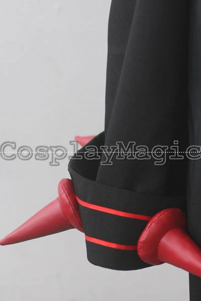 - Black overcoat with string closure, red faux leather spikes from the shoulders and the cuffs