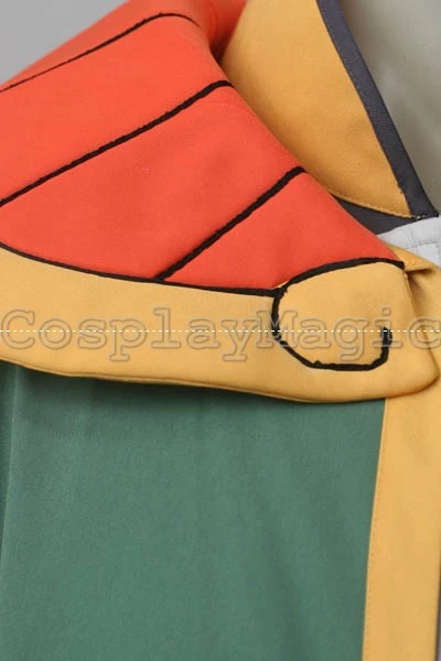 - Green and yellow coat with a red collar