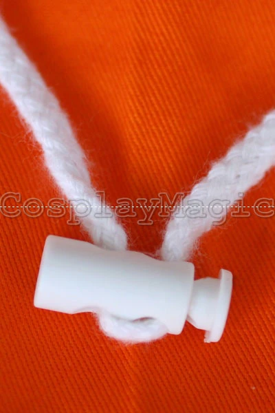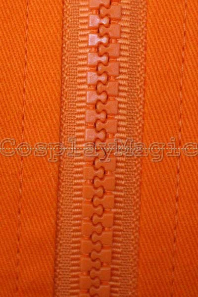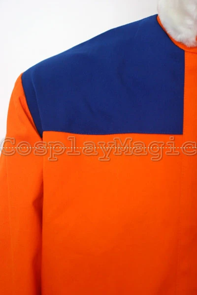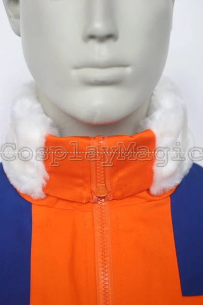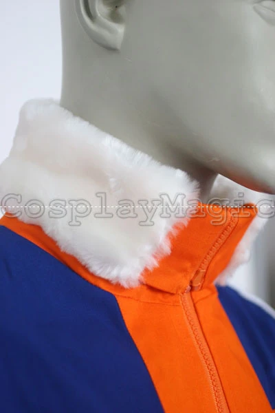 - Orange tracksuit with large white collar, blue shoulders and hem