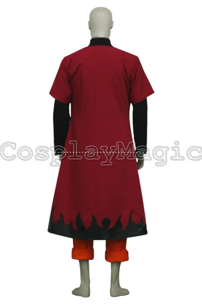 - Red short-sleeved coat with black faux leather flame pattern along the hemline