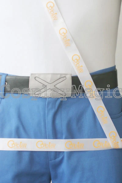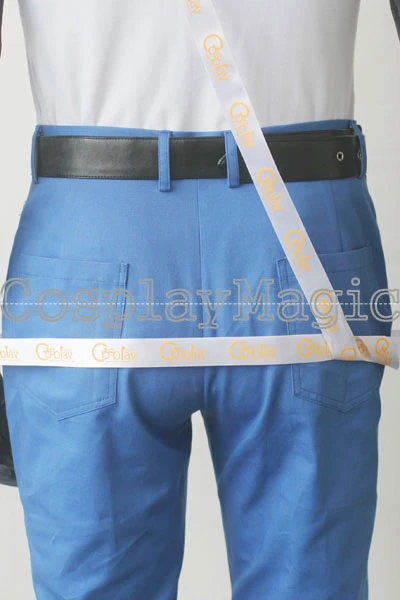 - Blue trousers with black faux leather belt