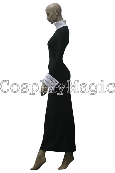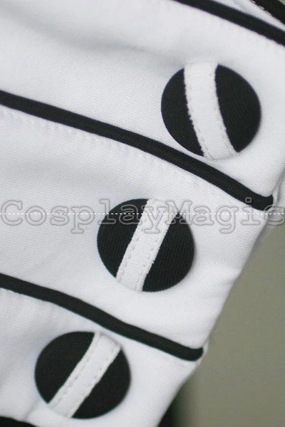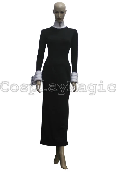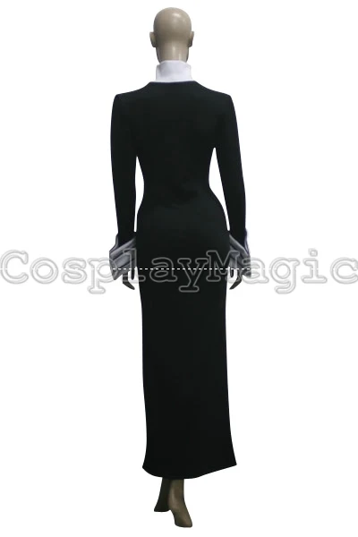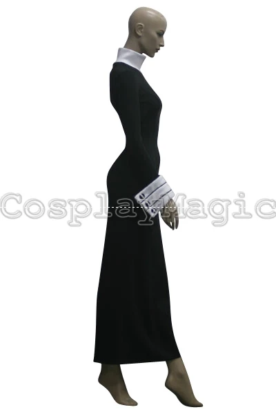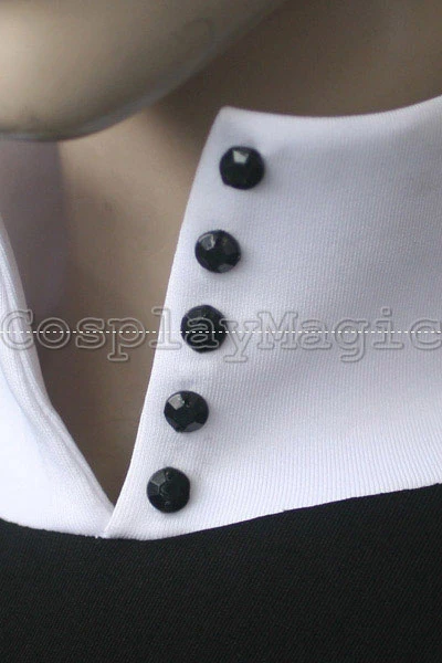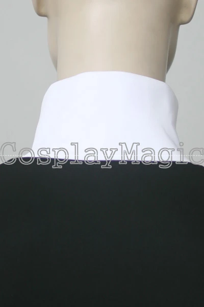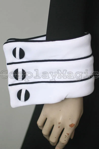 - Long black old-style robe with large white cuff-links and white button-up collar