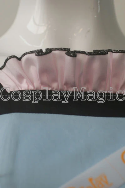 - Light blue one-piece dress with black collar, cuffs and belt