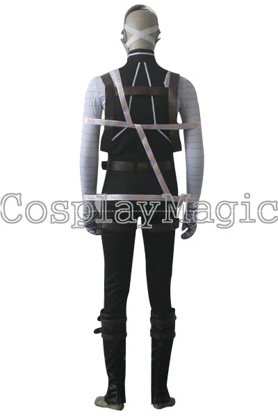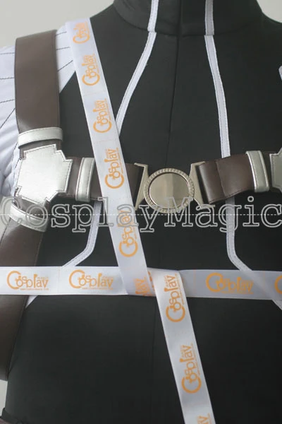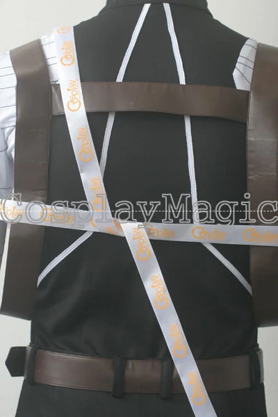 - Brown faux leather straps cross the chest and thigh