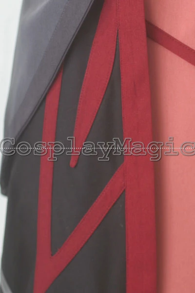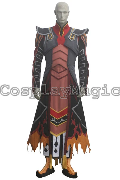 - Dark grey coat with light grey edges, ragged hem with orange faux leather flame patterns