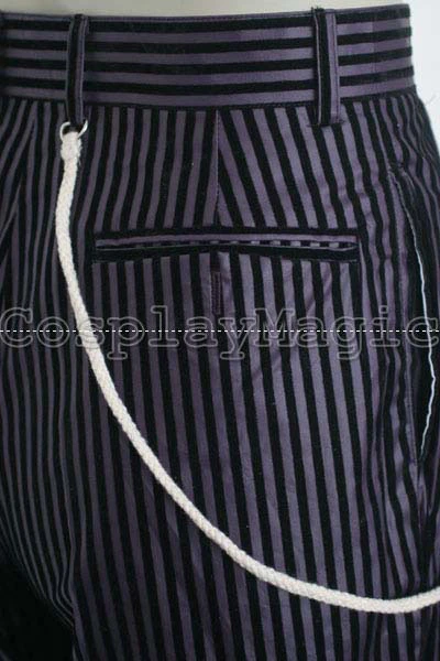 - Purple trousers with black stripes